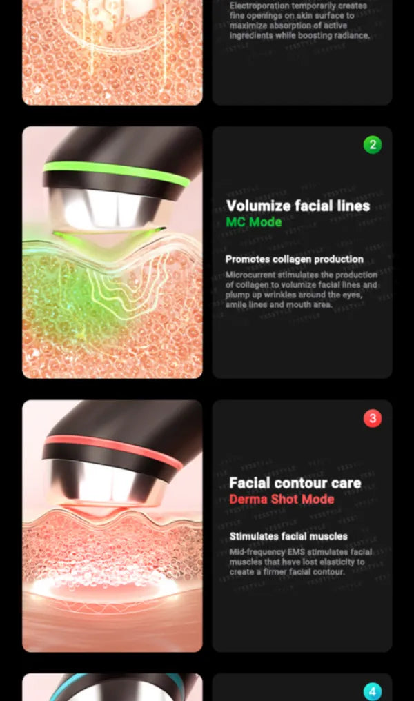 Acele electrice stimulează ușor pielea pentru îmbunătățirea texturii și absorbției produselor.