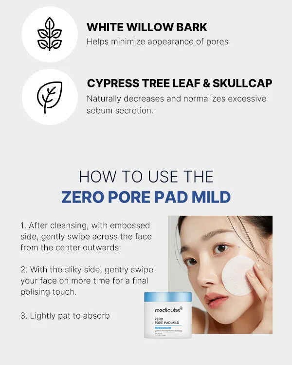 Medicube ZERO PORE PAD MILD sunt discuri cosmetice pre-îmbibate, concepute pentru a curăța porii și a reduce excesul de sebum fără a irita pielea. Potrivite pentru toate tipurile de ten, inclusiv sensibil și mixt, aceste pads oferă un efect calmant, uniformizează textura pielii și pregătesc tenul pentru hidratare.