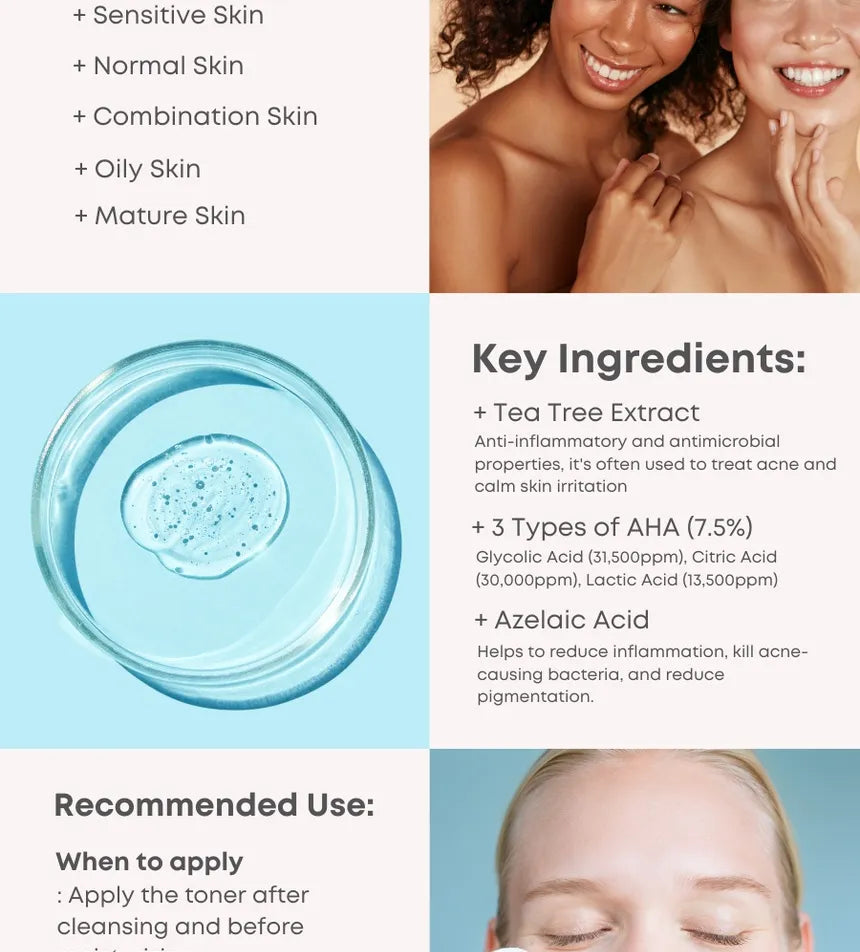 - Exfoliere blândă: AHA și BHA elimină celulele moarte și curăță porii, prevenind apariția coșurilor.
